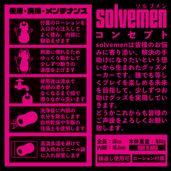 悩める男性のためのグッズメーカー「Solvemen(ソルブメン)」から、全長18cmのビッグサイズが登場!重量は肉厚な450g、柔らかな素材ですっぽり包み込み、長さと太さをダブルでカバー♪まったりナマ感が気持ちいいツブ膣壁と最奥にある子宮口へ注ぎ込む感覚をお楽しみください。