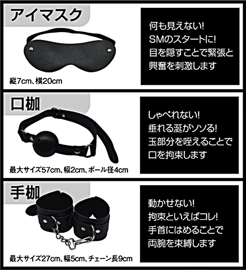 これひとつでSMプレイを網羅する豪華8点セット!SMプレイをスタートしたい、ビギナーなアナタにぴったりなSMグッズセットです。視覚を奪って緊張感が高まる「アイマスク」言葉を塞いで垂れる涎がそそる「口枷」動きを束縛する本格派拘束「手枷」身を捩る動きが音を奏でる「乳首クリップ」叩いた音が嗜虐を煽る「バラムチ」。