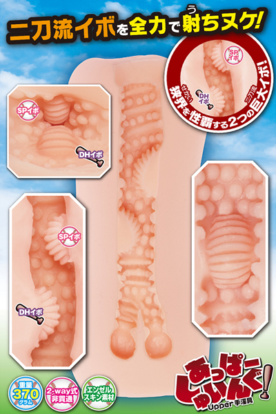 二刀流イボを全力で射ちヌケ!あっぱーしゅいんぐ!(Upper手淫具)は、ロングセラー商品「ふるしゅいんぐ!(FULL手淫具)」の続編となる、全長165mm、重量370gのミドルオナホールです(2way式非貫通)。
