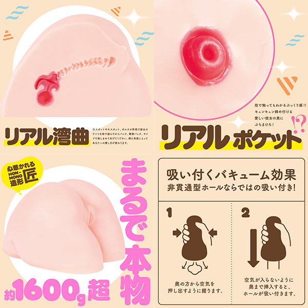 より本物を追求したリアルなお尻を、心惹かれるHON−MONO造形で再現し、ノーハンドでも楽しめる臨場感あるホールに!!平均サイズ、GスポットとAスポット、リアルに当たるポルチオ角度、波打つ肉壁、素材もこだわった「ふんわり柔肌、とろける生の感触、生の肉厚」。