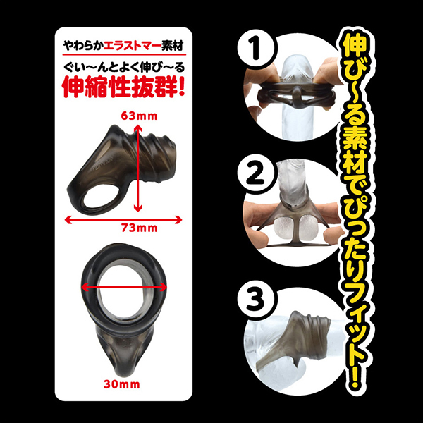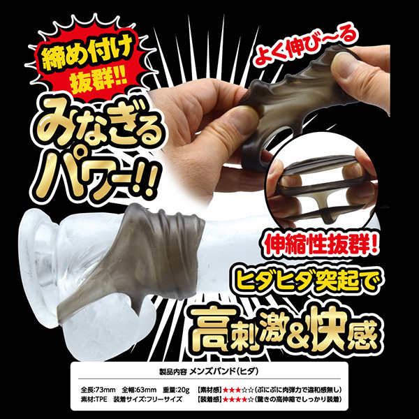 夜もがんばリングで大人気のやわらかメンズリング「ち●こリング」シリーズにスーパーなバンドが新登場!今度のち●こバンドは「ベースに装着するメンズバンド」!ぷにぷにっとした柔らかなTPE(エラストマー)素材は、ぐい〜んとよく伸びる高伸縮性!サイズ問わずでどんな大きさでもしっかりフィットの抜群の装着感&締付感!さらに、ライン状のヒダヒダ突起による高刺激快感が!男らしさを引き立たせるスモークカラー!ほとばしるストロング、みなぎるパワー!
