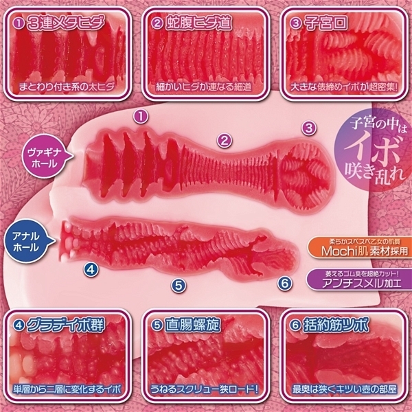 「子宮の中がすごいオナホ」というコンセプトの下、ヴァギナホールには「子宮での快感開花フィニッシュ」に向けて倍プッシュできる増幅ヒダ系を採用した非貫通オナホです。