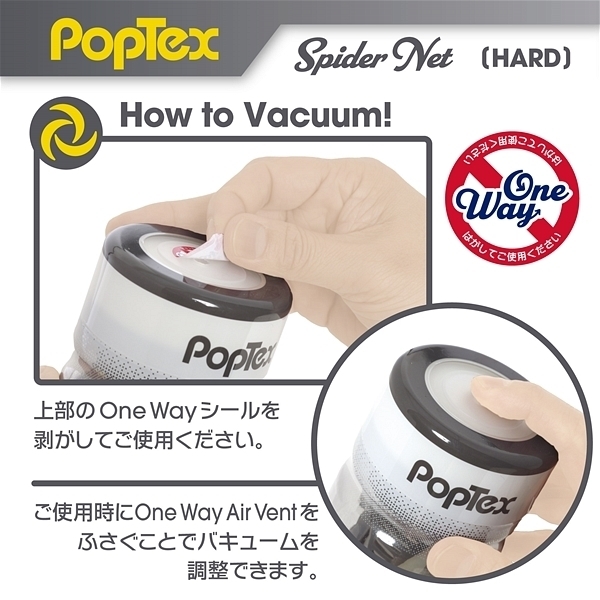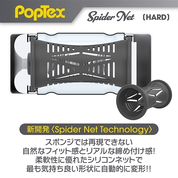 ポップテックススパイダーネットカップハード<リアルな締め付け×ネットヒダ刺激の高機能カップホール>新開発SpiderNetTechnology搭載型カップホール!ホールを包み込む柔軟性に優れたシリコンネットで最も気持ち良い形状に自動的に変形することでスポンジでは再現できない自然なフィット感とリアルな締め付け感を実現しました!内部構造は網目状のネットヒダの中心にアクセントのイボ刺激のアクセント!強力に吸い付く最奥のバキュームスポットは天面の「OneWay」シールを剥がし空気を抜いて挿入することで内部のまとわりつき感をより楽しむことが出来ます。