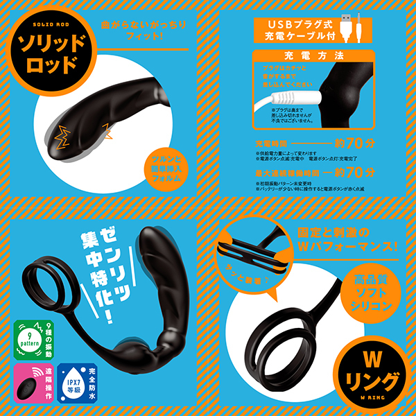 ●最大連続稼働時間約70分(初期振動パターン未変更時)●完全防水のIPX7等級9パターン振動●付属品:電池式リモコン、USBプラグ式充電ケーブル