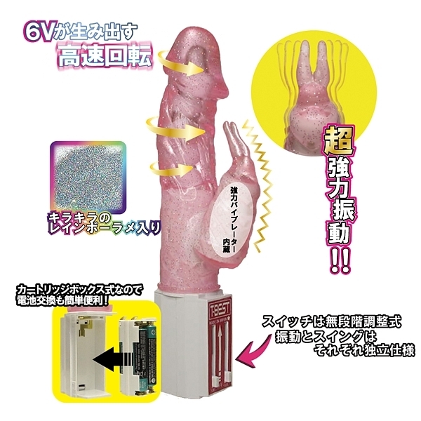 快感は無限に輪廻する…復活を遂げたくねりん棒シリーズから扱いやすいミドルサイズのハイパワーVER.が登場!レインボーラメも入ってキラッキラ☆彡6Vハイパワーが生み出す高速回転で、くねくねグリグリ ぐるぐるとこねくりまわす動きにもうメロメロ!絶頂、即イキ間違いなし!!さらに子機バイブは強力ローター内蔵で先端の突起がブルブル、ク●も同時に快感刺激!!電池を入れればすぐに使える楽々コントロールBOX、しかもカートリッジ式で電池交換も簡単便利!スイッチは振動とスイングがそれぞれ独立、無段階調整式でお好みの速度でお楽しみいただけます。