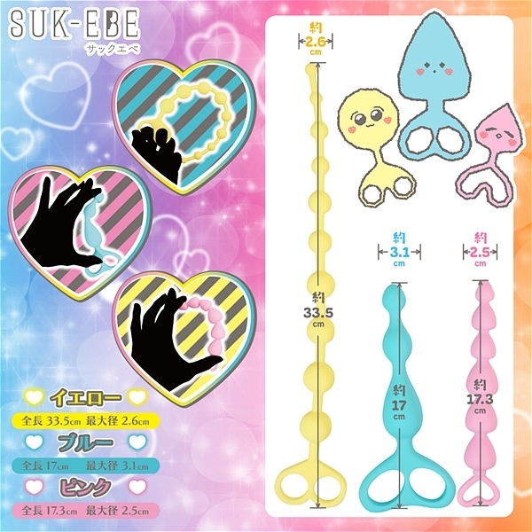 パッケージ:22.5×11.5×3.5cm 本体:ピンク(17.3×2.5cm)、ブルー(17.0×3.1cm)、イエロー(33.5×2.6cm)
